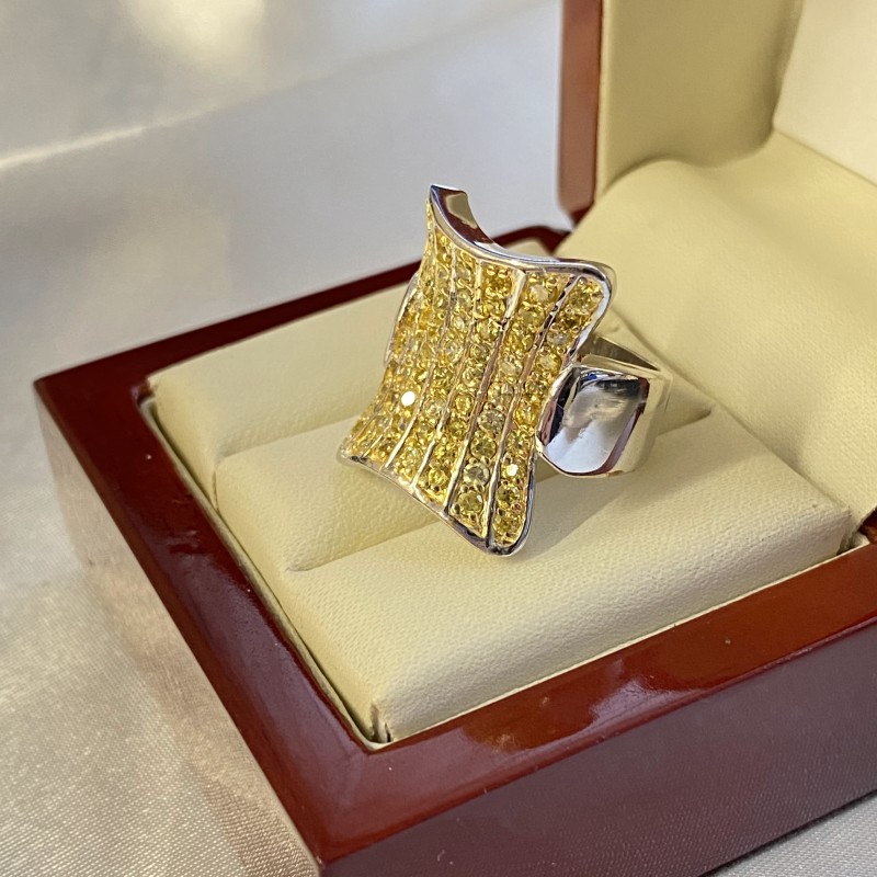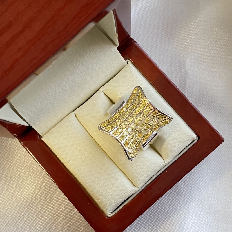 Ein entzückender, luxuriöser Ring mit bezaubernd funkelndem, zitronenfarbenem Zirkonia. Der Ring sieht in einem wunderschönen Rahmen aus 925er Sterlingsilber lakonisch und stilvoll aus. Betont perfekt die Zartheit, den Charme und die natürliche Schönheit Ihrer Hände! Das originelle Design des Rings spiegelt die Individualität und Einzigartigkeit des Bildes wider!