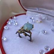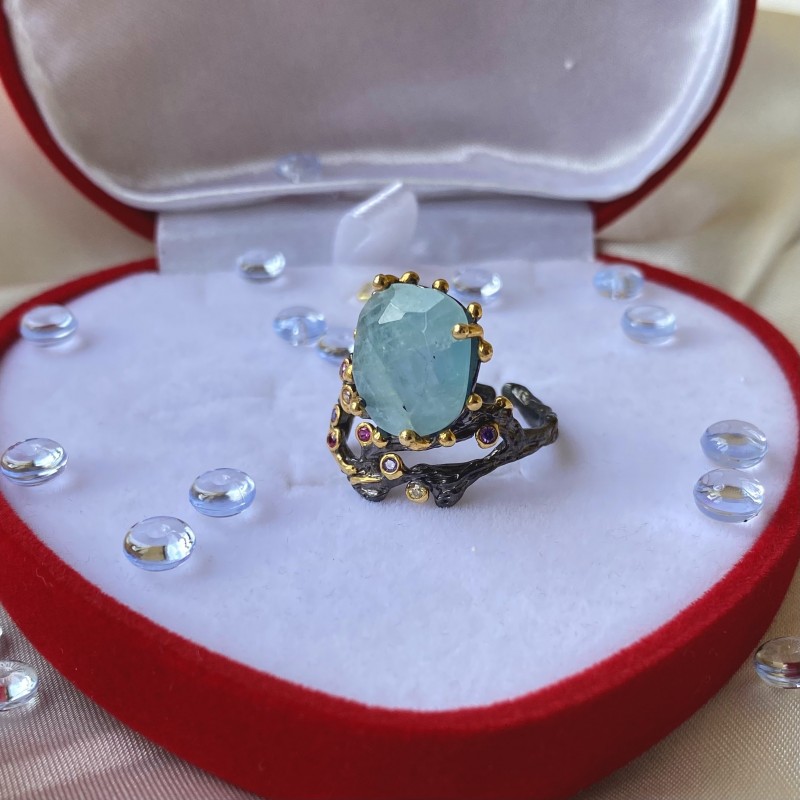 Ein atemberaubender Ring aus geschwärztem 925er Sterlingsilber mit massiver Gelbgoldbeschichtung, verziert mit wunderschönem Aquamarin und mehrfarbigen Zirkonia. Durch gekonnt gesetzte Akzente mittels Vergoldung wirkt der Ring einzigartig schön. Eine hervorragende Ergänzung für Ihr Bild von Weiblichkeit und Romantik.