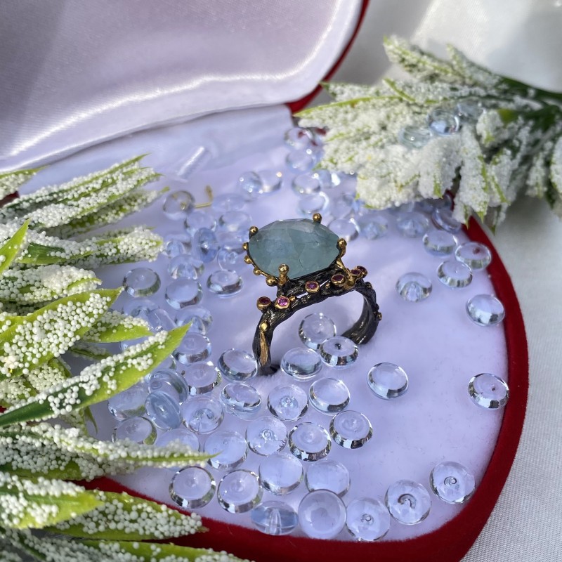 Ein atemberaubender Ring aus geschwärztem 925er Sterlingsilber mit massiver Gelbgoldbeschichtung, verziert mit wunderschönem Aquamarin und mehrfarbigen Zirkonia. Durch gekonnt gesetzte Akzente mittels Vergoldung wirkt der Ring einzigartig schön. Eine hervorragende Ergänzung für Ihr Bild von Weiblichkeit und Romantik.