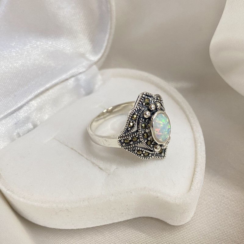 Ein schicker Ring aus geschwärztem 925er Sterlingsilber mit Einsätzen aus bezauberndem Opal und tiefem Markasit. Ein solcher Ring wird die Raffinesse des Geschmacks unterstreichen und Ihnen das Gefühl geben, eine echte Königin zu sein.