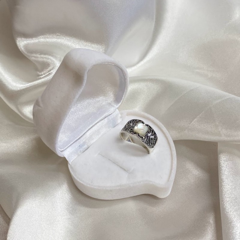 Ein schicker Ring aus geschwärztem 925er Sterlingsilber mit Einsätzen aus bezauberndem Opal und tiefem Markasit. Ein solcher Ring wird die Raffinesse des Geschmacks unterstreichen und Ihnen das Gefühl geben, eine echte Königin zu sein.
