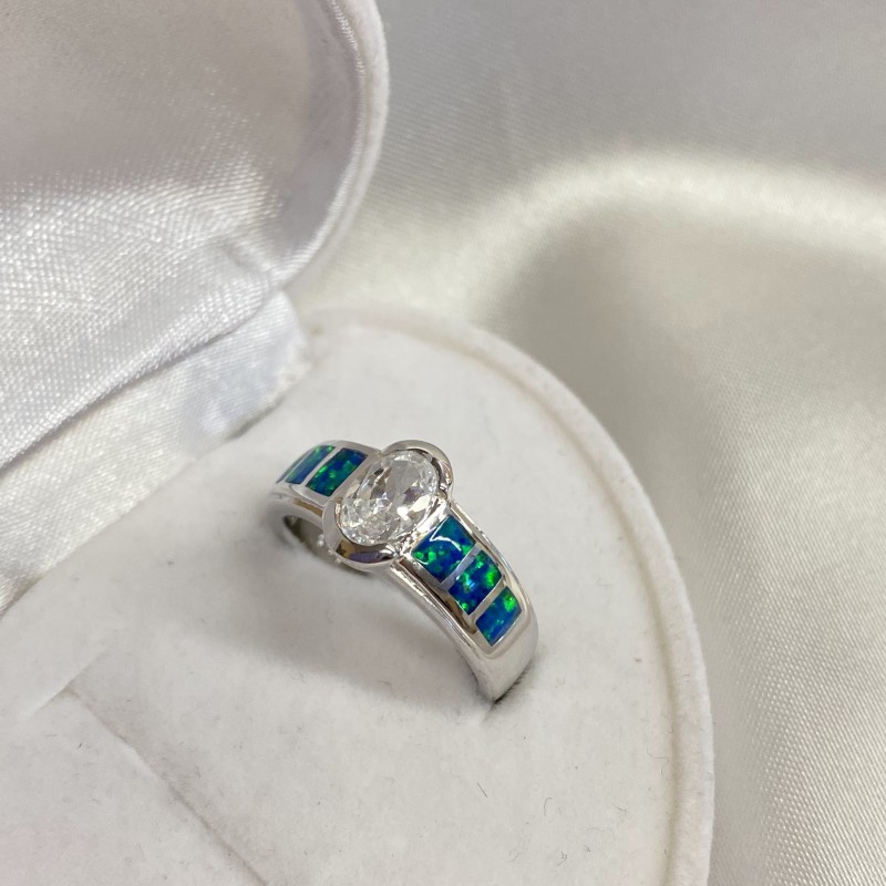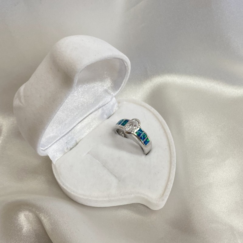 Zarter Ring aus 925er Sterlingsilber mit Einsätzen aus bezaubernd schillerndem blaugrünem Opal und großen funkelnden Zirkonia. Die ungewöhnliche Form des Opals in Kombination mit großen Zirkonia erzeugt ein einzigartiges Muster. Ein solcher Ring wird die Raffinesse des Geschmacks unterstreichen und Ihnen das Gefühl geben, eine echte Königin zu sein.