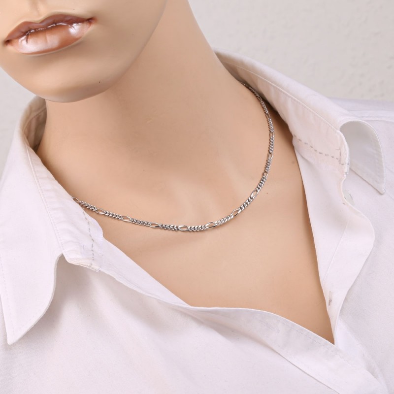 Klassische Kette aus 925º-Silber im Figaro-Geflecht mit Diamantbearbeitung und rhodiniert. „Figaro“ ist eine Kombination aus langen und kurzen Gliedern. Diese Produkte sind für Vertreter jeden Alters und Geschlechts geeignet und sehen sowohl im Alltag als auch beim Ausgehen zu einer Abendveranstaltung großartig aus. Eine mit der Figaro-Webtechnik hergestellte Kette oder ein Armband ist ein tolles Geschenk für jeden Anlass, da diese Art von Produkt immer das Auge erfreut, zu jedem Kleidungsstil passt und niemanden gleichgültig lässt.
