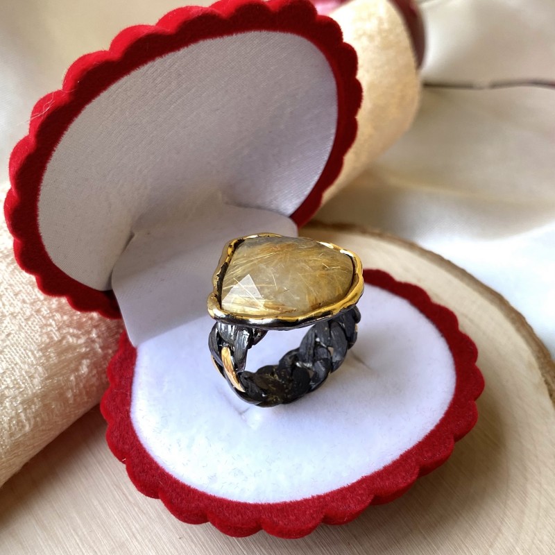 Ein bezaubernder Ring aus geschwärztem 925er Sterlingsilber mit massiver Gelbgoldbeschichtung, besetzt mit Rutilquarz. Durch gekonnt gesetzte Akzente mittels Vergoldung wirkt der Ring einzigartig schön. Eine hervorragende Ergänzung für Ihr Bild von Weiblichkeit und Romantik.