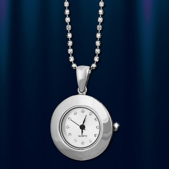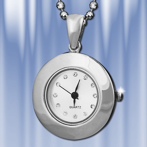 Stilvoller silberner Uhrenanhänger. Der Durchmesser der Uhr beträgt 25 mm. Quarzwerk. Das Zifferblatt ist mit Zirkon verziert. Kette „Kugel“ 70 cm lang.