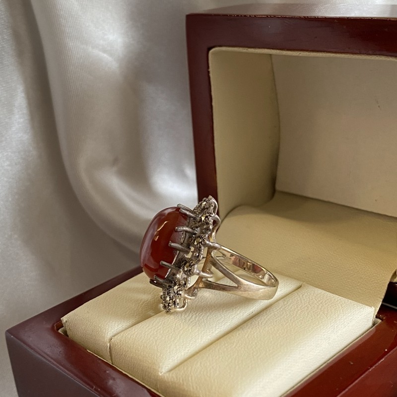 Origineller Ring aus geschwärztem 925er Silber mit Einsätzen aus tiefem Markasit und ausgezeichnetem Achat. Ein solcher Ring unterstreicht die Raffinesse des Geschmacks und die Anmut der Hände.