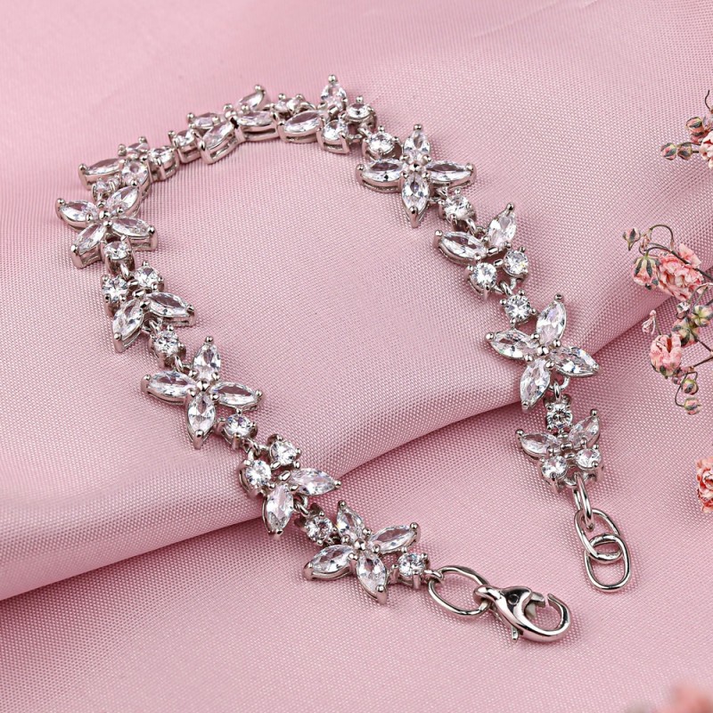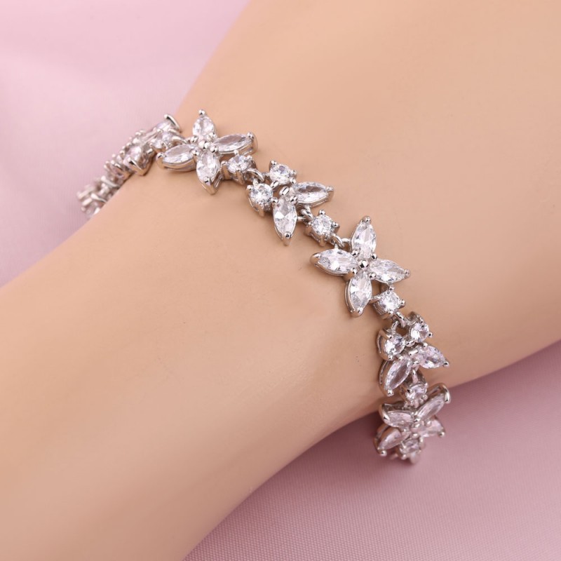 Zartes, feminines Armband aus 925er Sterlingsilber mit Einsätzen aus funkelnden Zirkonia! Die Steine mit jedem ihrer Gesichter schimmern in den Sonnenstrahlen. Ein ausgezeichnetes Geschenk für einen geliebten Menschen.