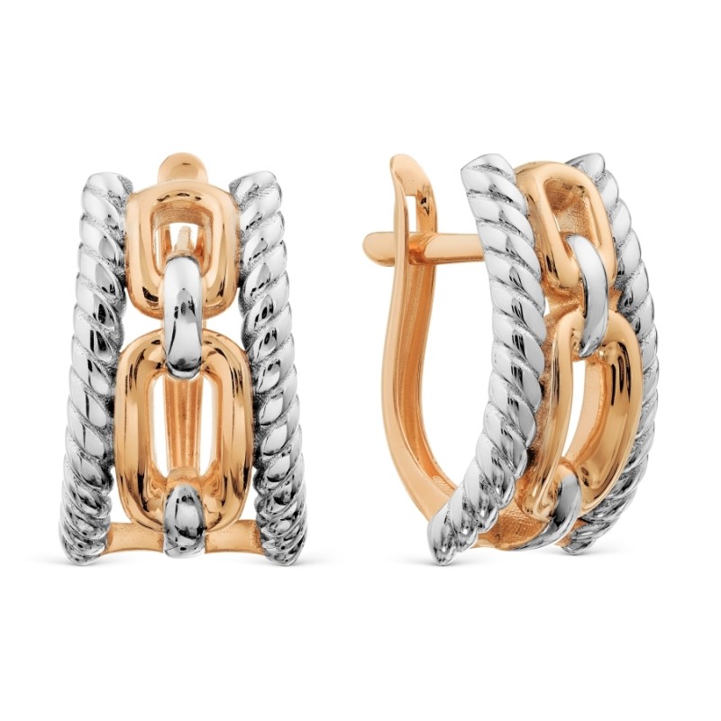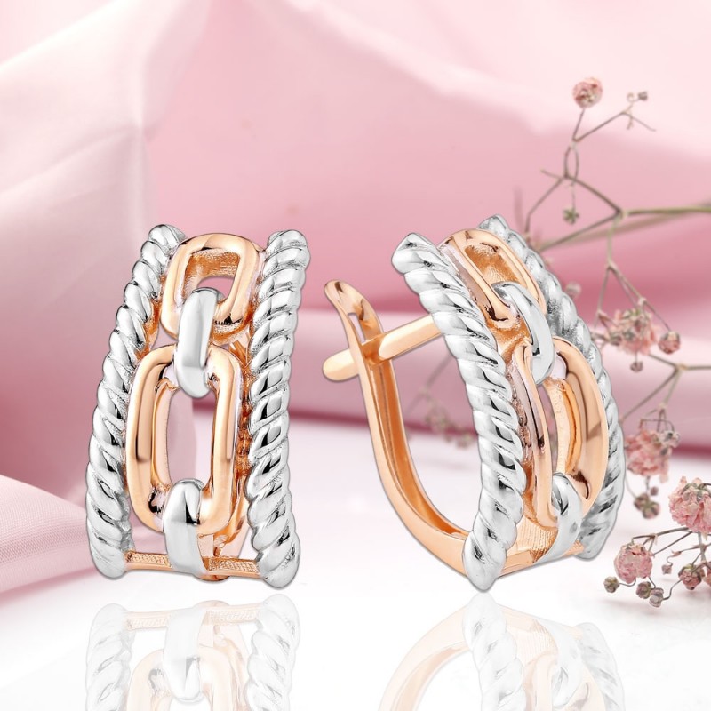 Χρυσά σκουλαρίκια από ρωσικό χρυσό 585. Γυναικεία, κομψά σκουλαρίκια από ροζ χρυσό 585, διακοσμημένα με διαμάντια λευκοχρυσού. Θα αναδείξει την κομψότητα και τη θηλυκότητά σας και θα προσελκύσει βλέμματα θαυμασμού.