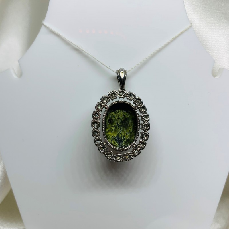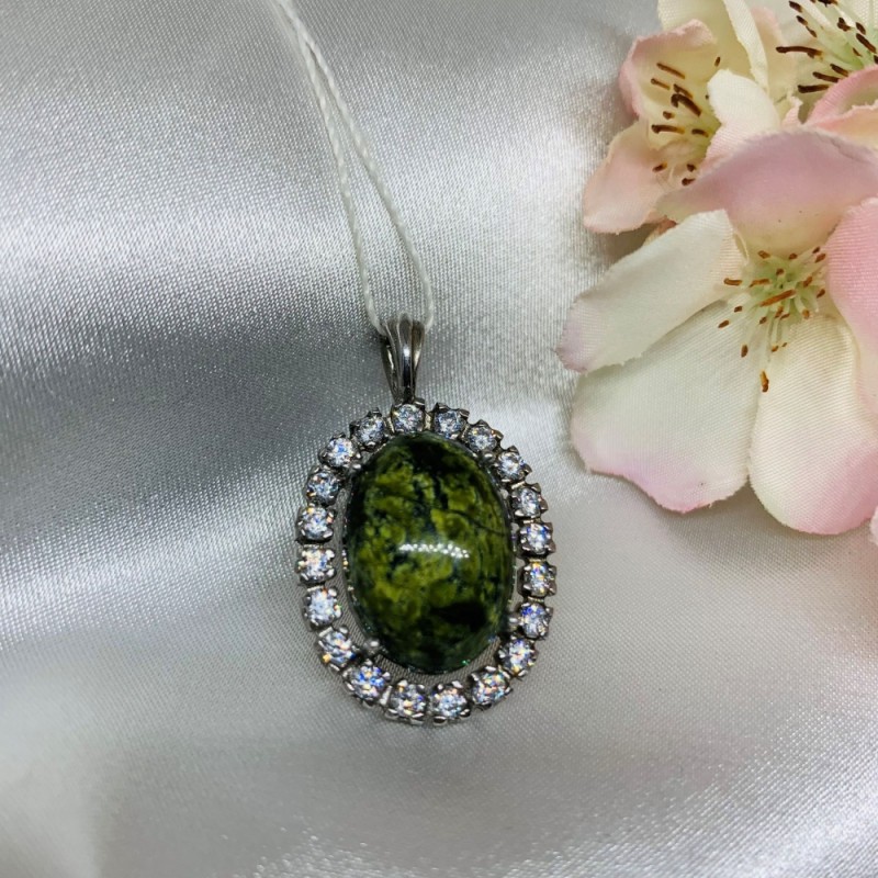 Ασημένιο μενταγιόν με ένθετο από μεγάλο σερπεντίνη διακοσμημένο με ζιργκόν. Μαυρισμένο ασήμι 925. Η τέλεια προσθήκη στην εμφάνισή σας!