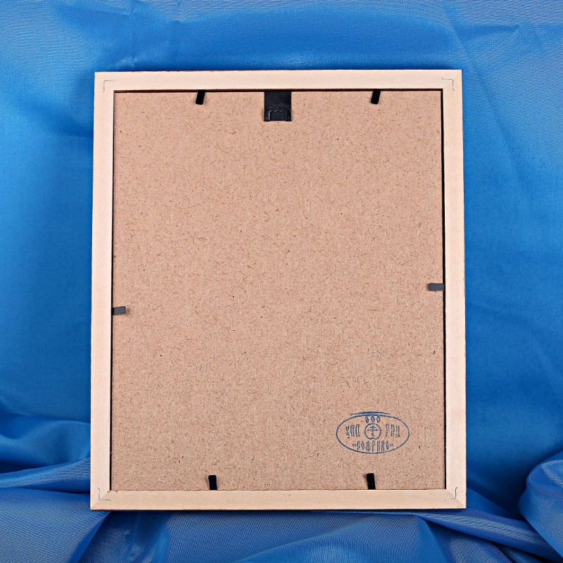 Εικονίδιο σε ξύλινο πλαίσιο. Ανάγλυφο με «χρυσά» και «ασημί» χρώματα. Το εικονίδιο είναι κάτω από γυαλί, το οποίο το προστατεύει από τη σκόνη και το ξεθώριασμα. Στο πίσω μέρος του εικονιδίου υπάρχει ένα άγκιστρο για την προσάρτηση του εικονιδίου στον τοίχο.