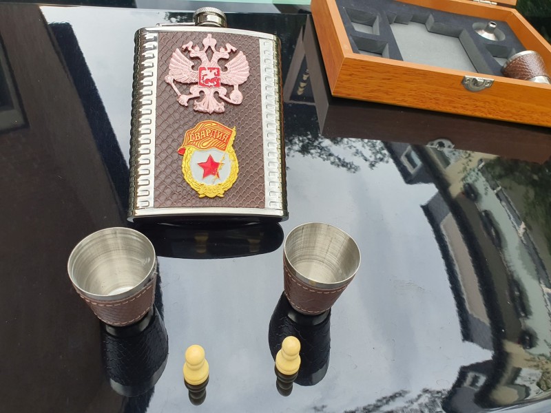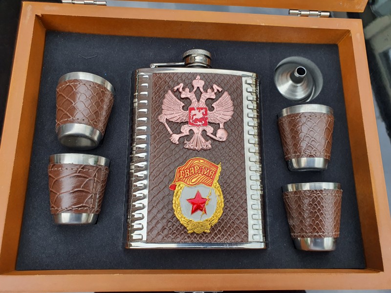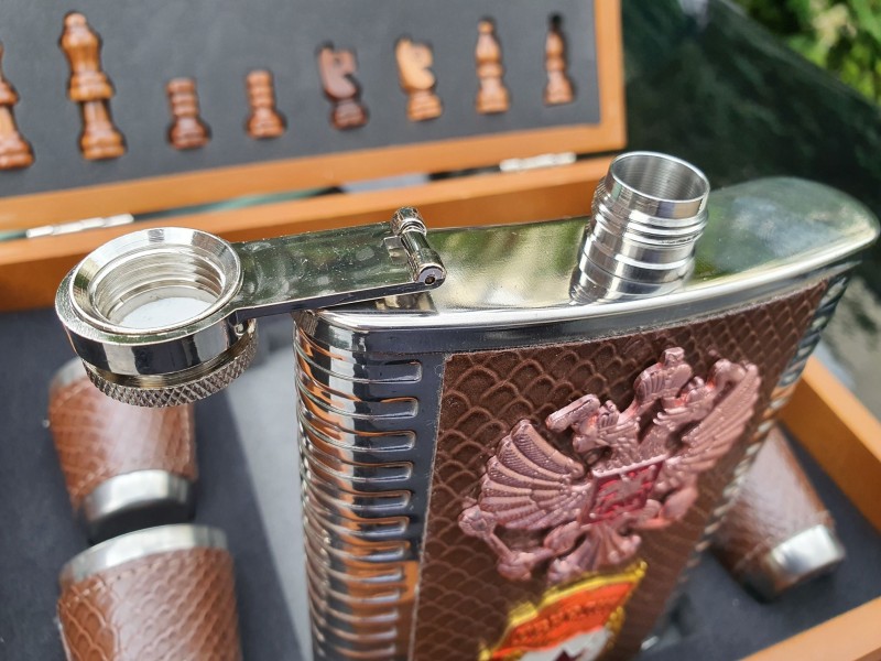 Πρωτότυπο σετ δώρου του σετ σκακιού με το μεταλλικό μπουκάλι με το εθνόσημο της Ρωσίας. Αποτελείται από ένα σετ ξύλινων κομματιών σκακιού, ένα μεταλλικό μπουκάλι χωρητικότητας 250 χιλιοστόλιτρων, τέσσερα μεταλλικά κύπελλα και ένα μεταλλικό χωνί για το γέμισμα του μπουκαλιού. Όλα αυτά βρίσκονται μέσα στην υψηλής ποιότητας ξύλινη θήκη, με τη σκακιέρα στο καπάκι.