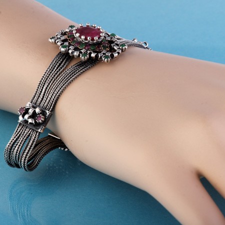 Ένα κομψό και πολυτελές βραχιόλι κοσμήματος με ρουμπίνια, σμαράγδια. Ασήμι 925°. Διάμετρος: 18 cm, πλάτος 28 mm