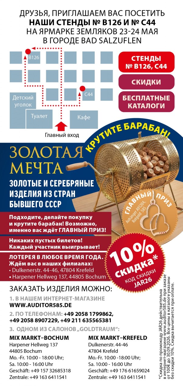 Καλώς ήρθατε στο Auditor 585 - το επίσημο ηλεκτρονικό κατάστημα εισιτηρίων για τη ρωσική εμπορική έκθεση στο Bad Salzuflen. Περάστε ένα αξέχαστο Σαββατοκύριακο με τους συμπατριώτες σας, με ποικίλα αξιοθέατα, δραστηριότητες και διασκέδαση για όλη την οικογένεια! Εξασφαλίστε τα εισιτήριά σας για τη ρωσική εμπορική έκθεση - γρήγορα και εύκολα online.