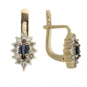 Classically pretty yet eye-catching red Russian gold earrings with 0.35 ct boat sapphires and 24 brilliant cut KR-57 diamonds totaling 0.45 ct.