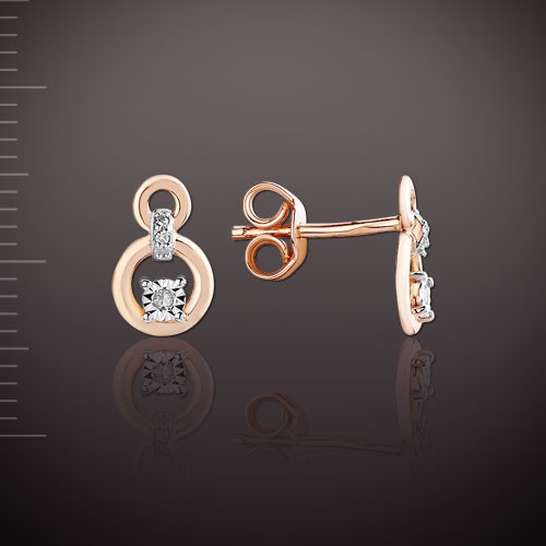 Stud earrings made of Russian red gold 585 º with 4 brilliant-cut diamonds ¢ 1.0 mm 0.01 ct, 2 brilliant-cut diamonds ¢ 1.5 mm 0.014 c