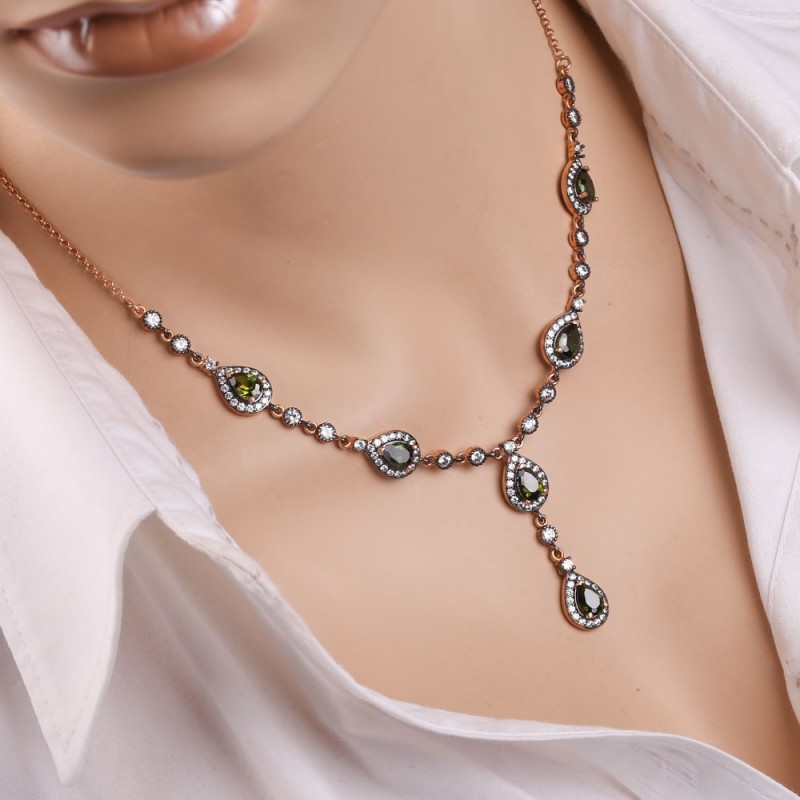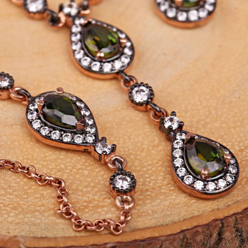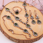 A delightful ethnic set made of red gold-plated blackened 925 sterling silver with inserts of sparkling zirconia and chrysolite! The combination of these enchanting stones gives the product a unique look and captivates the eye. Such a set will emphasize the tenderness, femininity and charm of its mistress!