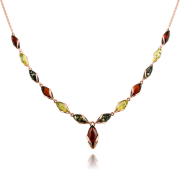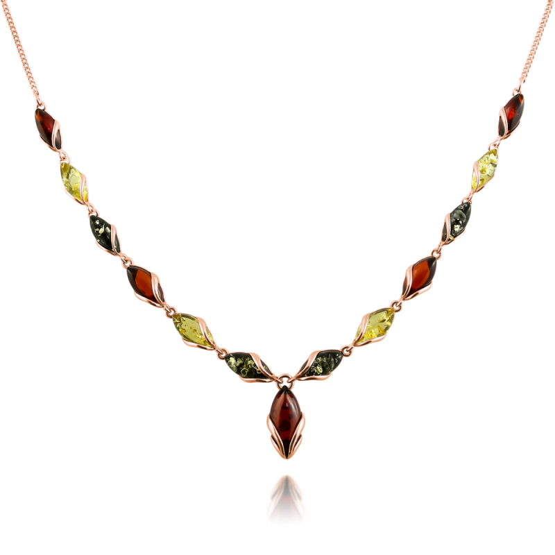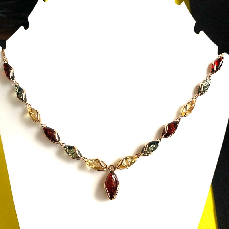 Elegant necklace made of gold-plated 925 silver, decorated with green, honey and cognac colored amber, with this amazing "piece of the sun", will delight and delight you thanks to its beauty! A unique opportunity to emphasize your individuality, to convey the image of femininity, sunshine and tenderness.