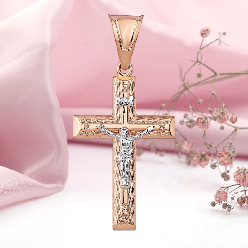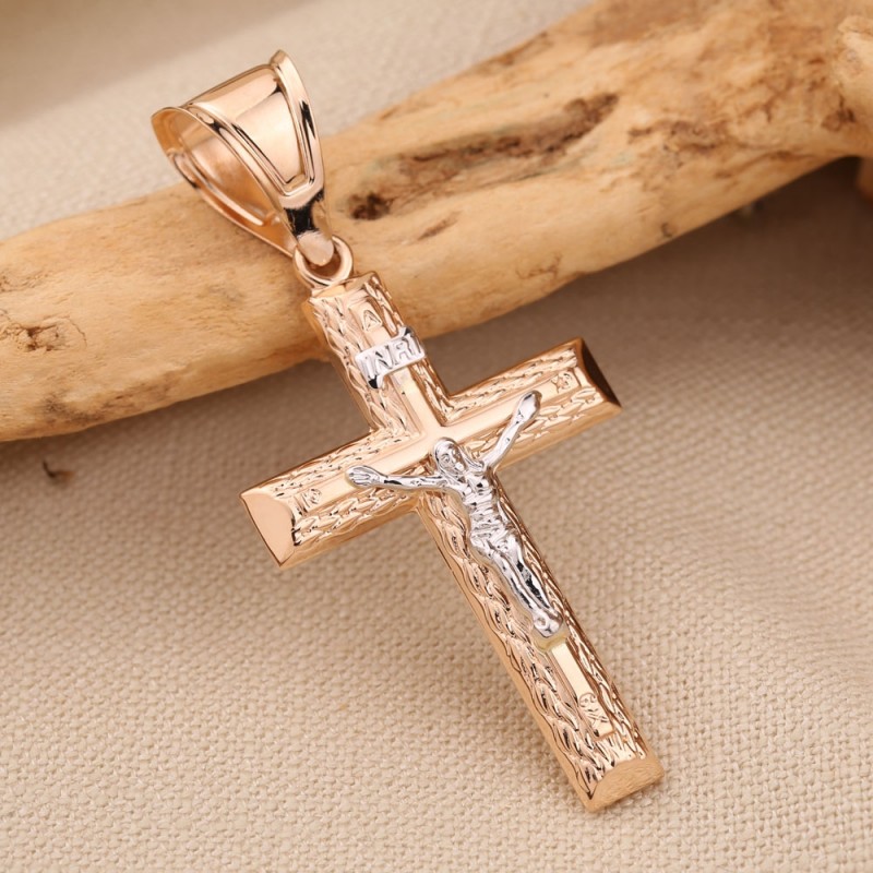 Russian gold 585 in Germany cross pendant with a crucifix made of 585 white/red gold. The figure of Christ and the inscription “INRI” are made of white gold. A protective prayer “Save and Preserve” is engraved on the back of the cross. At the top of the cross there is a ring for a cord or chain. Does not scratch when worn.
