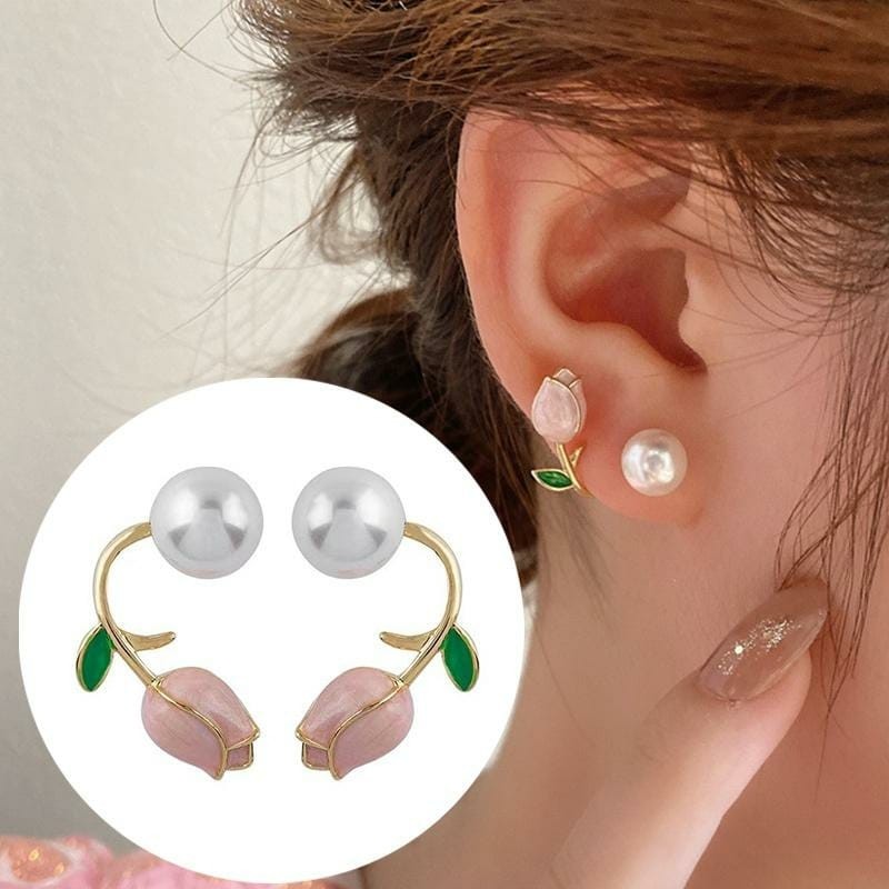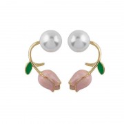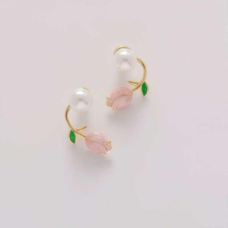 Charming, delicate stud earrings made of metal alloy with inserts of faux pearls and decorated with multi-colored enamel are a great addition to everyday and festive wear. Tulips are placed on the post with a ring and can also be easily removed, turning tulip earrings into pearl stud earrings without tulips.