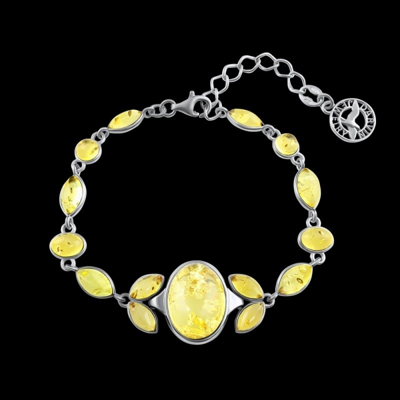 A festive feminine bracelet made of rhodium-plated 925 silver decorated with amber, with this amazing "piece of the sun", playing in all shades of honey color, enchanting and captivating with its beauty, will delight you again and again! A unique opportunity to emphasize your individuality, convey the image of femininity and tenderness. A beautiful combination of glittering silver and sunny amber gives your look a festive mood!