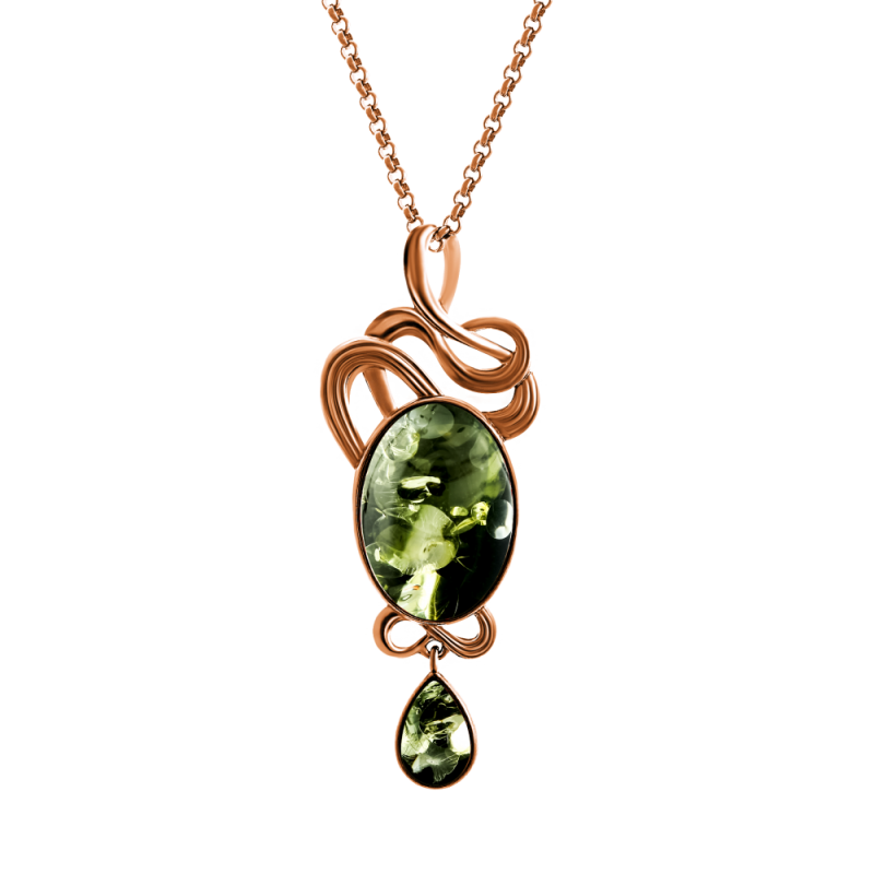 Green amber is an amazing variety of this stone, the beauty of which is emphasized by its deep color and expressive brilliance. This shade looks most advantageous in gilded silver. It favorably shades the color of amber, emphasizes its structure, adds additional charisma. Silver jewelry with green amber is a special accessory that fits perfectly into everyday life and as a complement to an office suit or evening dress.