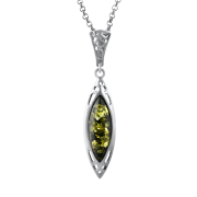 A charming pendant in the shape of 925 silver with a rhodium plating and unique green amber, with this amazing "piece of the sun" that plays with all shades of green.
