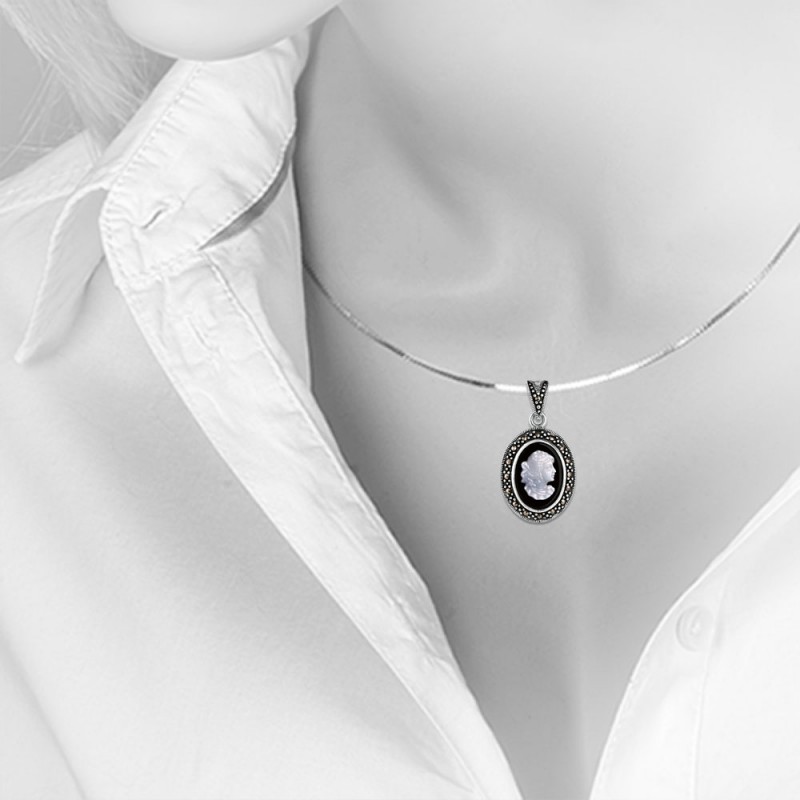 A chic antique-style pendant made of blackened 925 sterling silver with a large mother-of-pearl insert on a background of black onyx and mysterious marcasites!