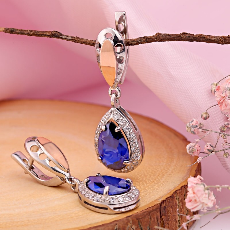 Silver earrings with gold zirconia. Chic earrings made of 925 sterling silver with accents made of 375 rose gold with sparkling zirconia inserts and large blue zirconia! This combination of two valuable metals looks very elegant. A wonderful gift or an opportunity to treat yourself.