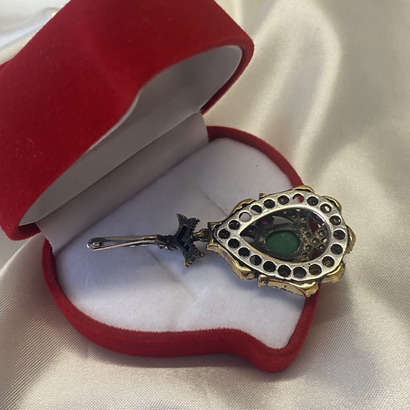 Insert: 2 emerald drops 10.0 x 8.0 mm; 10 ruby circles Ø 2.5 mm; Zirconia Ø 2.0 mm; 1.5mm