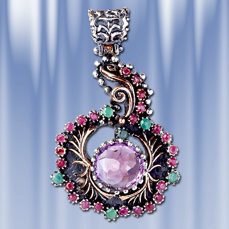 A stylish and luxurious jewelry - pendant with a large insertion of amethyst is lined with rubies and emeralds. Silver 925 °. Height: 55 mm, width 30 mm