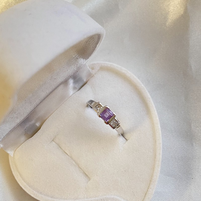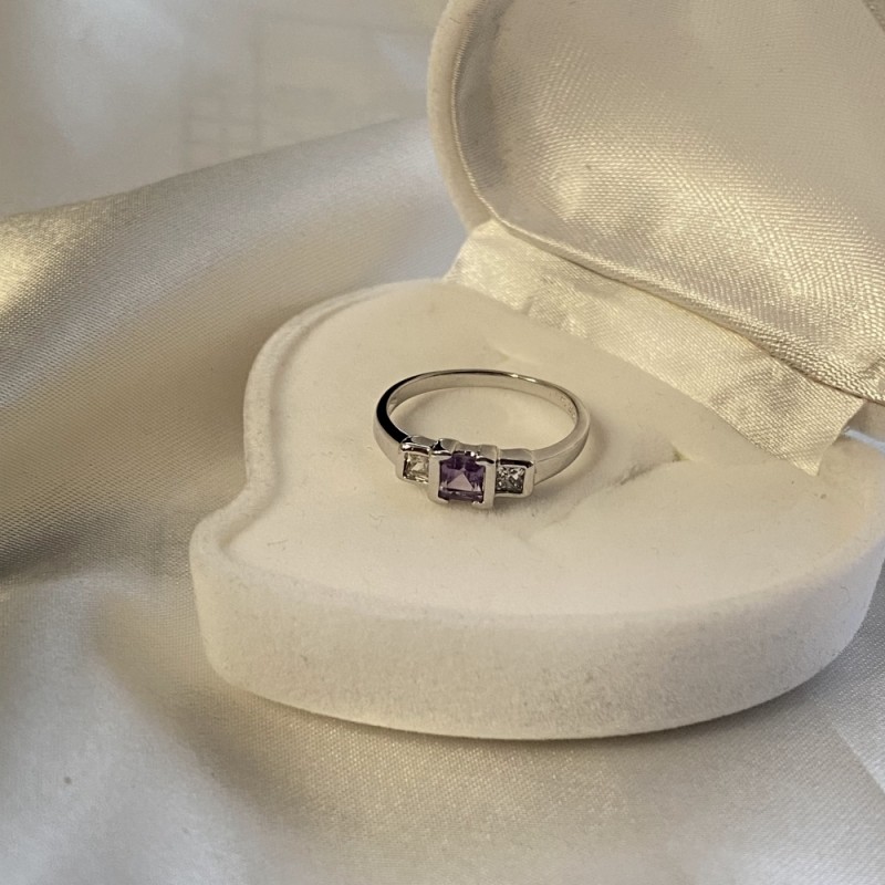 Delightful, luxurious ring with charming sparkling square-shaped zirconias, colorless and amethyst colored. The ring looks concise and stylish in a beautiful frame made of 925 sterling silver, creating a bright and lively composition. It will perfectly emphasize the delicacy, charm and natural beauty of your hands! The original design of the ring will reflect your individuality!