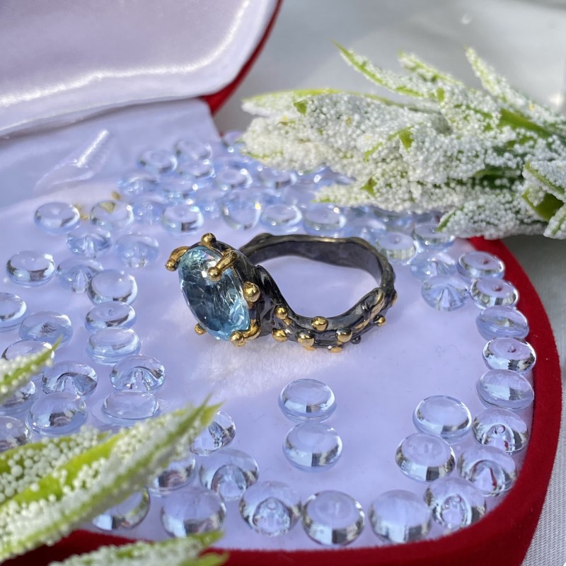 A charming ring made of blackened 925 silver with solid yellow gold plating, decorated with beautiful large topaz. Thanks to skillfully placed accents using gold plating, the ring looks uniquely beautiful. An excellent addition to your image of femininity and romance.