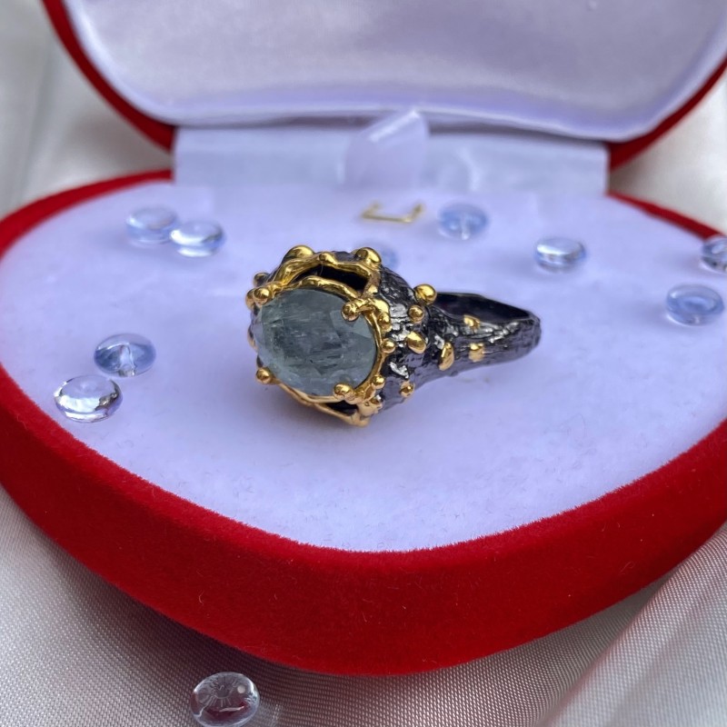 A charming ring made of blackened 925 silver with solid yellow gold plating, decorated with beautiful large aquamarine. Thanks to skillfully placed accents using gold plating, the ring looks uniquely beautiful. An excellent addition to your image of femininity and romance.