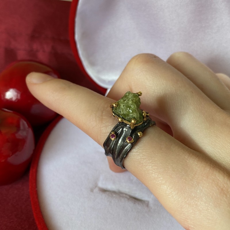 A charming Ottoman style ring made of blackened 925 silver with solid yellow gold plating, decorated with beautiful chrysolite and cubic zirconia. Thanks to skillfully placed accents using gold plating, the ring looks uniquely beautiful. An excellent addition to your image of femininity and romance.