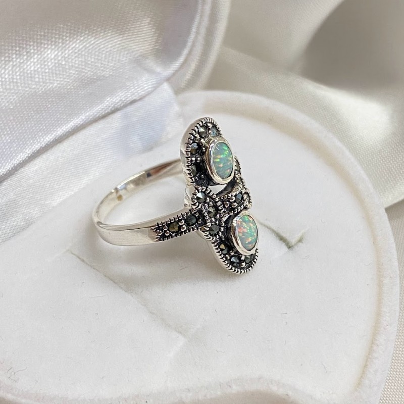 Beautiful ring made of blackened 925 sterling silver with enchanting opal and deep marcasite inserts. Such a ring will emphasize the refinement of taste and make you feel like a real queen.