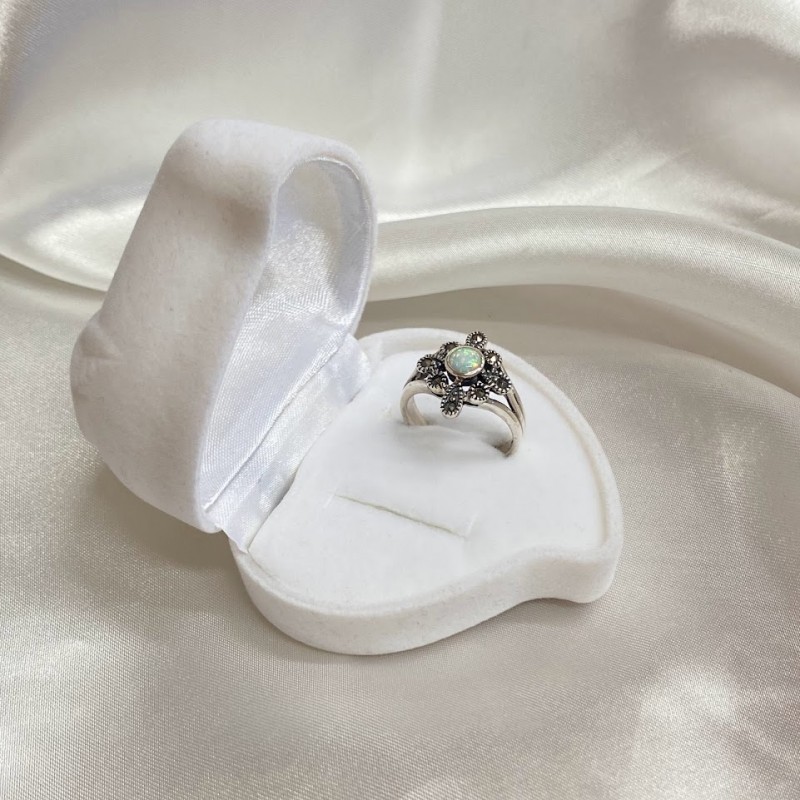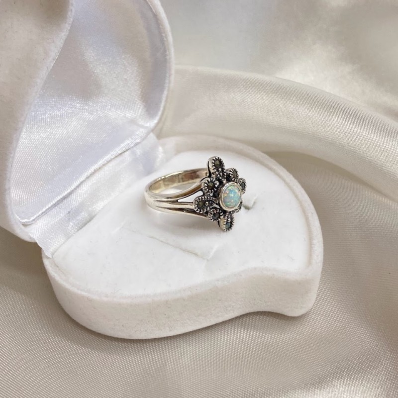 Beautiful ring made of blackened 925 sterling silver with enchanting opal and deep marcasite inserts. Such a ring will emphasize the refinement of taste and make you feel like a real queen.