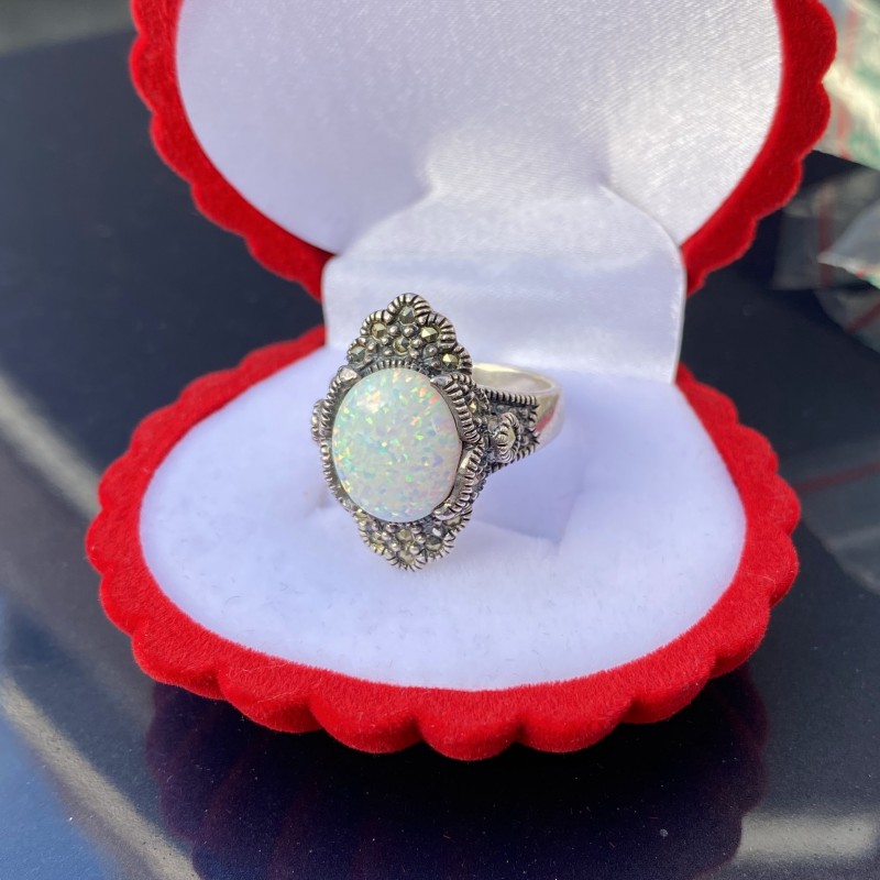 Beautiful ring made of blackened 925 sterling silver with enchanting opal and deep marcasite inserts. Such a ring will emphasize the refinement of taste and make you feel like a real queen.