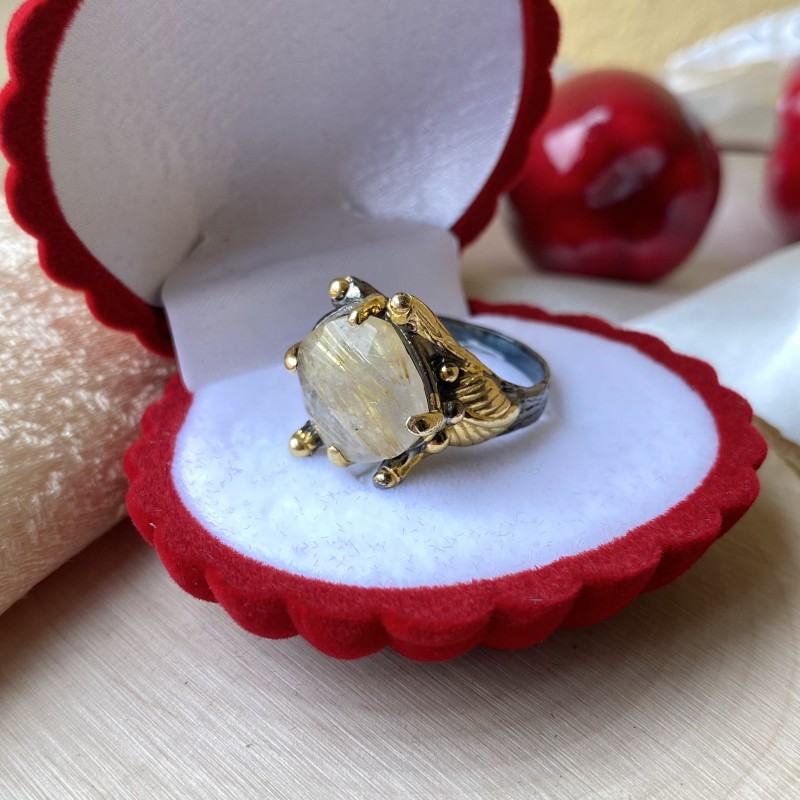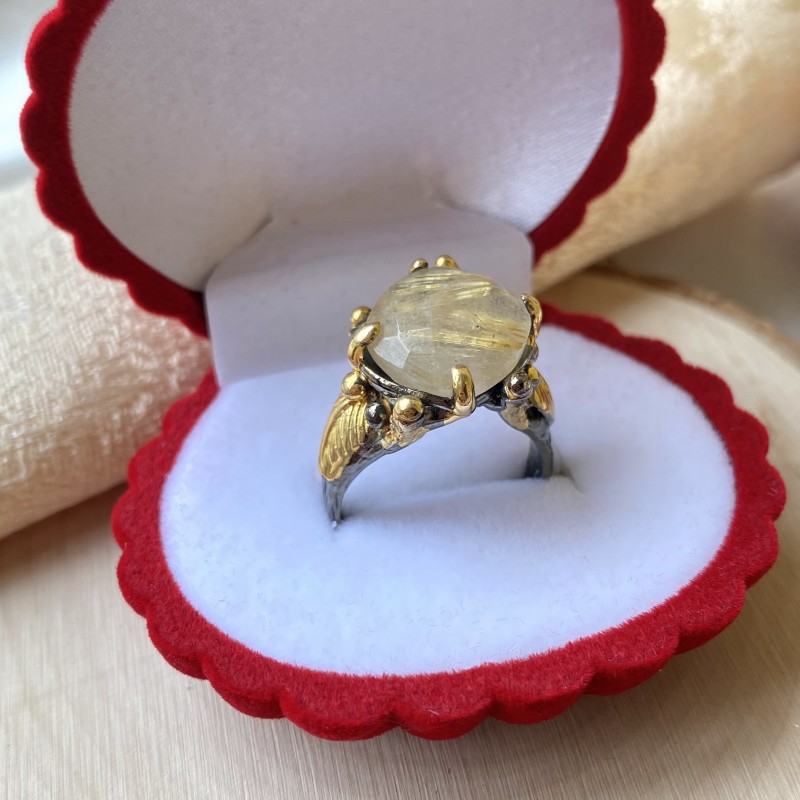 A charming ring made of blackened 925 silver with solid yellow gold plating, decorated with beautiful rutilated quartz. Thanks to skillfully placed accents using gold plating, the ring looks uniquely beautiful. An excellent addition to your image of femininity and romance.