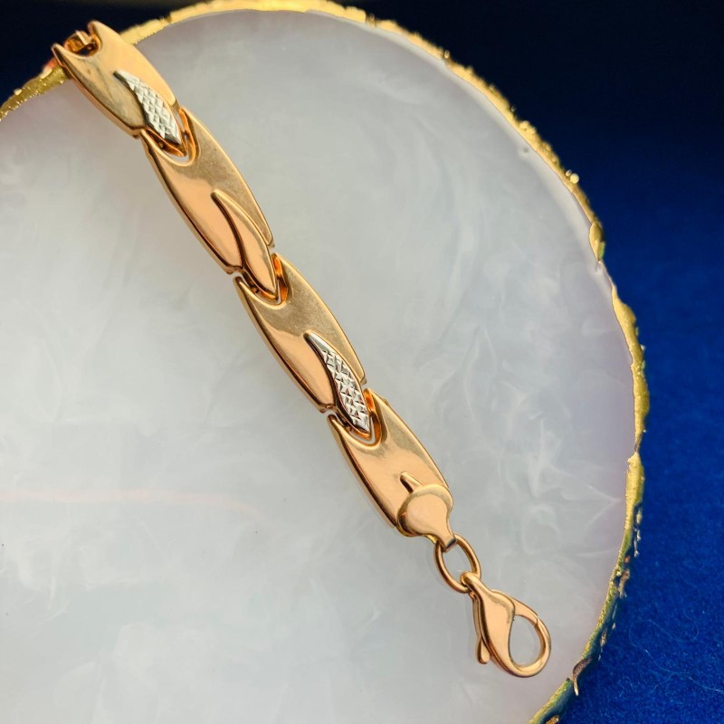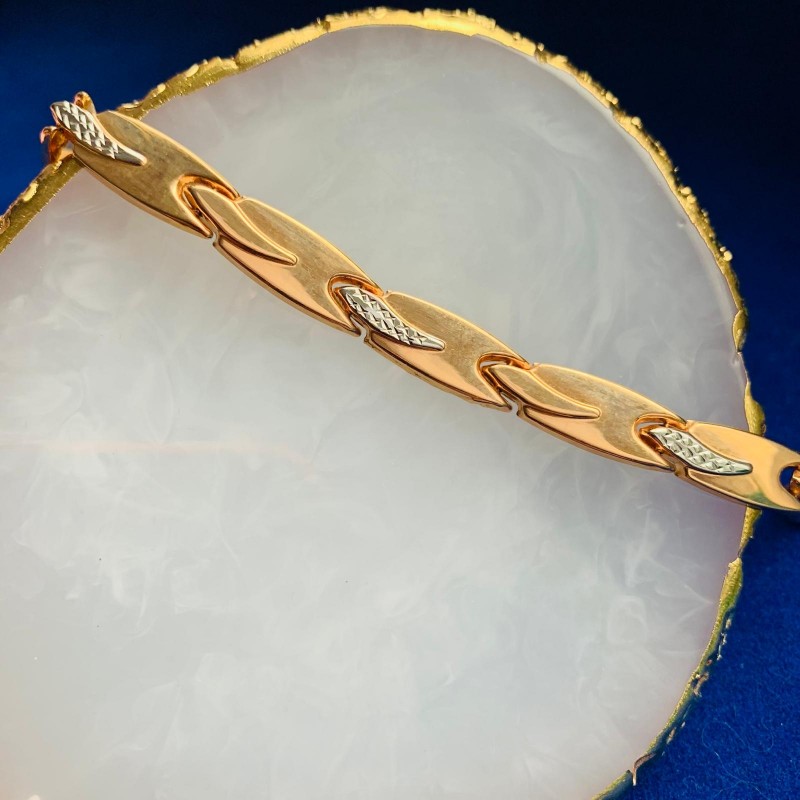 Bracelet made of red gold/white gold 585 °. The graceful and voluminous bracelet made of 585 white gold and red gold with sparkling diamond cut. The inside of the bracelet is smooth with a mirror surface. Brackets made of gold set the necessary accent in the picture and draw attention to the wealth and luxury of the accessories, because gold is beautiful, stylish, chic and expensive. Fits both a solid lady and a young woman.