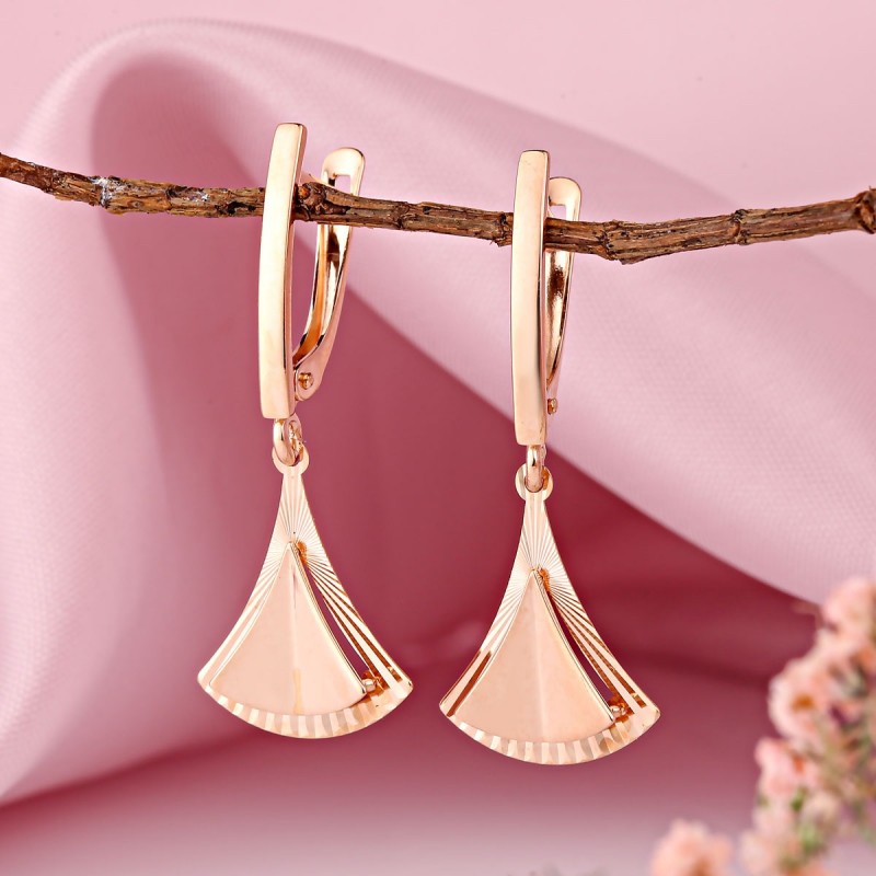 Pendientes colgantes de oro 585. Estos pendientes parecen un juego de luces y formas: la silueta en forma de abanico se despliega en finos rayos y crea con cada movimiento un brillo vivo y brillante.