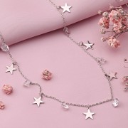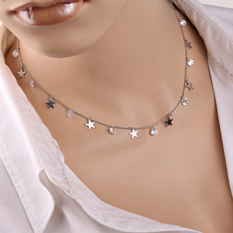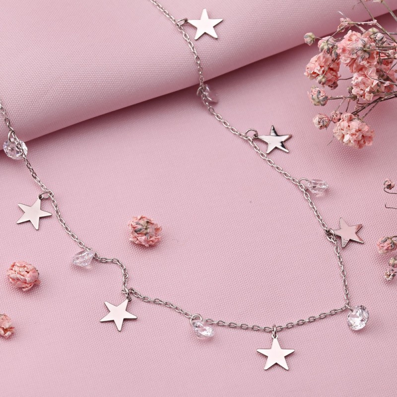 ¡Collar de plata de ley 925 con colgante decorativo en forma de estrellas y circonitas brillantes! Tejido por urdimbre: anclas, procesamiento de diamantes. Maravilloso énfasis en tu ternura e irresistibilidad.