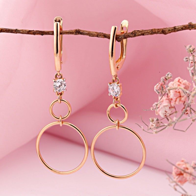 Pendientes oro 585 circonitas. Estos pendientes combinan una ligereza moderna con una geometría elegante. Los círculos que se balancean suavemente forman una silueta aireada, mientras que una brillante circonita en el centro atrae la atención. El engaste de la piedra está refinado con un elegante revestimiento de rodio, que crea un brillo fresco y crea un sofisticado contraste con el cálido oro rojo 585.