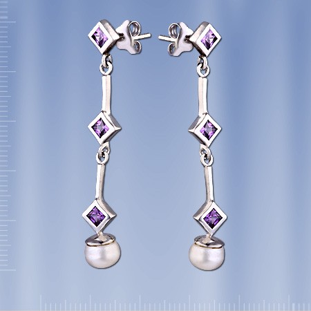 Pendientes elaborados en plata 925° con perla (¢ 7 mm), amatista (3 x 3 mm). Altura aprox.48 mm.