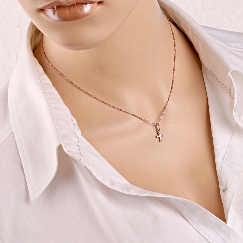 Colgante cruz con cadena de oro realizada en oro rojo 585 con talla diamante. Collar de oro rojo 585 con colgante de cruz y cadena Singapur