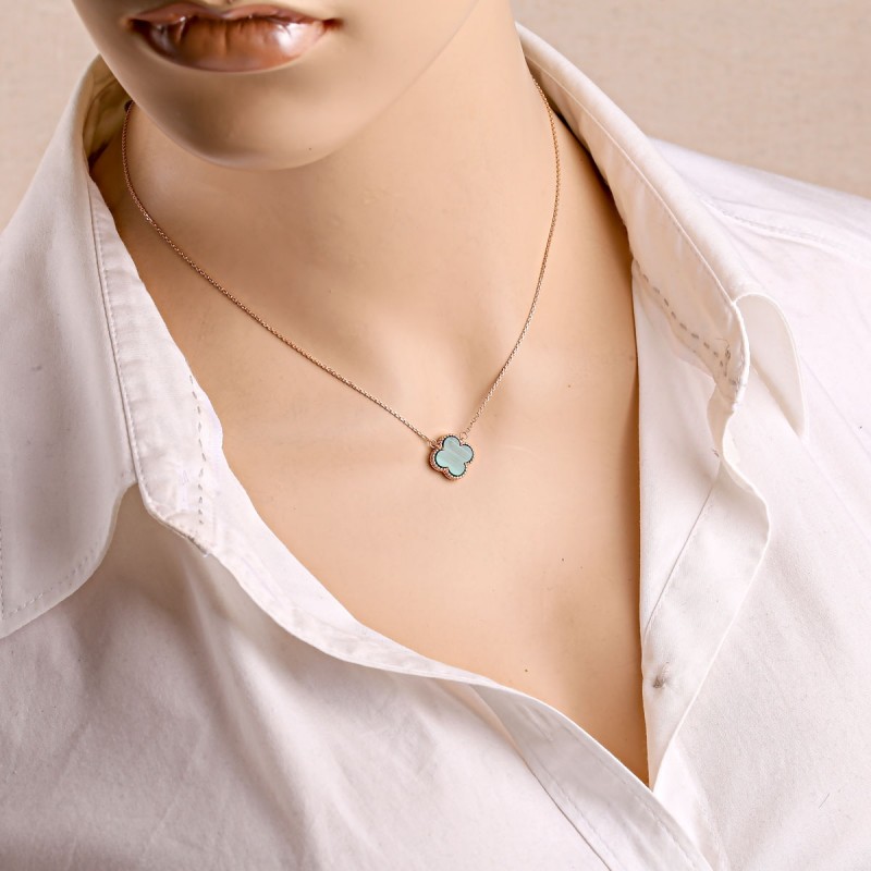 El elemento de cuatro hojas parece suave y armonioso, mientras que el tamaño más grande de la decoración otorga a las joyas más presencia y valor. La malaquita despliega aquí todo su efecto y aporta profundidad y un carisma noble.