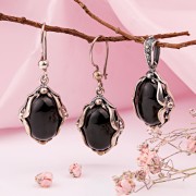 Un fascinante conjunto elaborado en plata de ley ennegrecida (925) que combina el esplendor de épocas pasadas con la sofisticación moderna. Las piedras ovaladas de ónix (ágata negra) captan la luz en su profundidad y confieren al conjunto un aspecto misterioso y majestuoso.