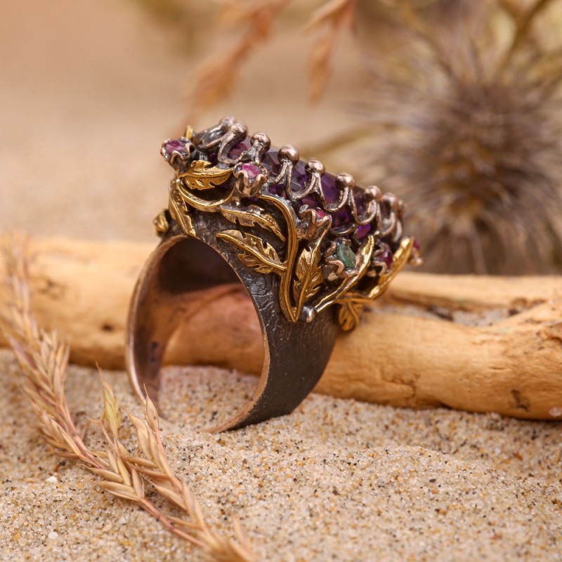 ¡Elegante anillo étnico de estilo otomano, elaborado a mano en plata de ley 925 ennegrecida con un gran inserto de amatista, esmeraldas y rubíes! El anillo está decorado con un dibujo en relieve calado de bronce noble, que subraya el estilo antiguo del artículo. Las mujeres han intentado durante mucho tiempo resaltar su belleza, fragilidad y encanto con la ayuda de joyas. La joyería femenina oriental tiene muchas caras. Pueden enfatizar tanto la gracia y la modestia como la extravagancia de la imagen.
