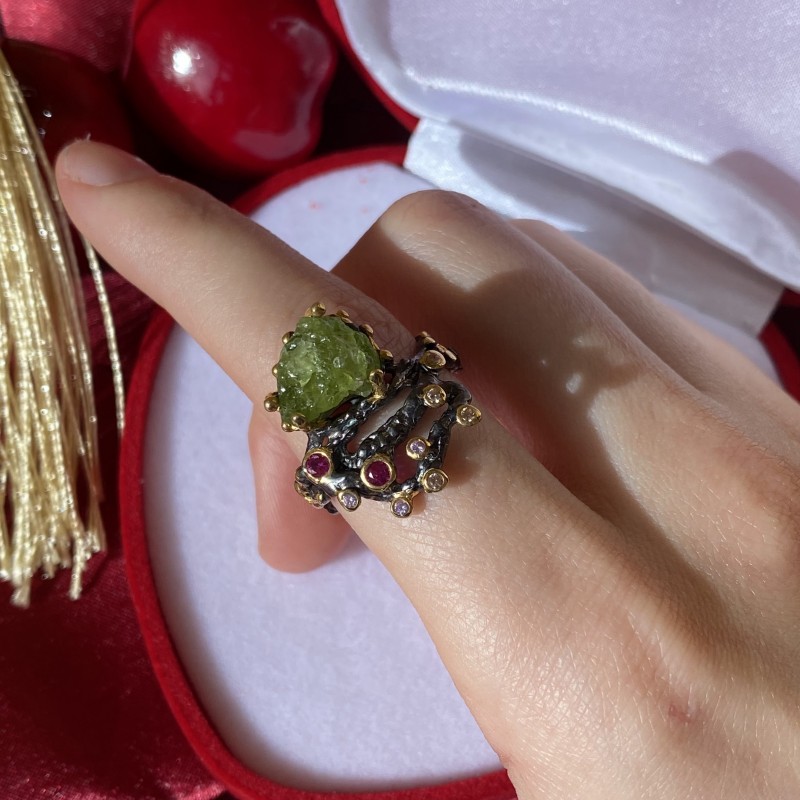 Un encantador anillo de estilo otomano elaborado en plata 925 ennegrecida con baño de oro amarillo macizo, decorado con una hermosa crisólita y circonita cúbica. Gracias a los detalles hábilmente colocados mediante baño de oro, el anillo tiene un aspecto excepcionalmente hermoso. Una excelente adición a tu imagen de feminidad y romance.