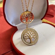 Delicado collar elaborado en acero joya con revestimiento resistente al desgaste en color oro rosa. ¡Las joyas hechas de acero para joyería 316L no se oxidan, no se oxidan y son absolutamente inofensivas para la salud! Tejido de ancla de doble cadena. Ambos collares están decorados con colgantes en forma de árbol, uno con circonitas y el otro sin ellas.