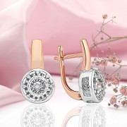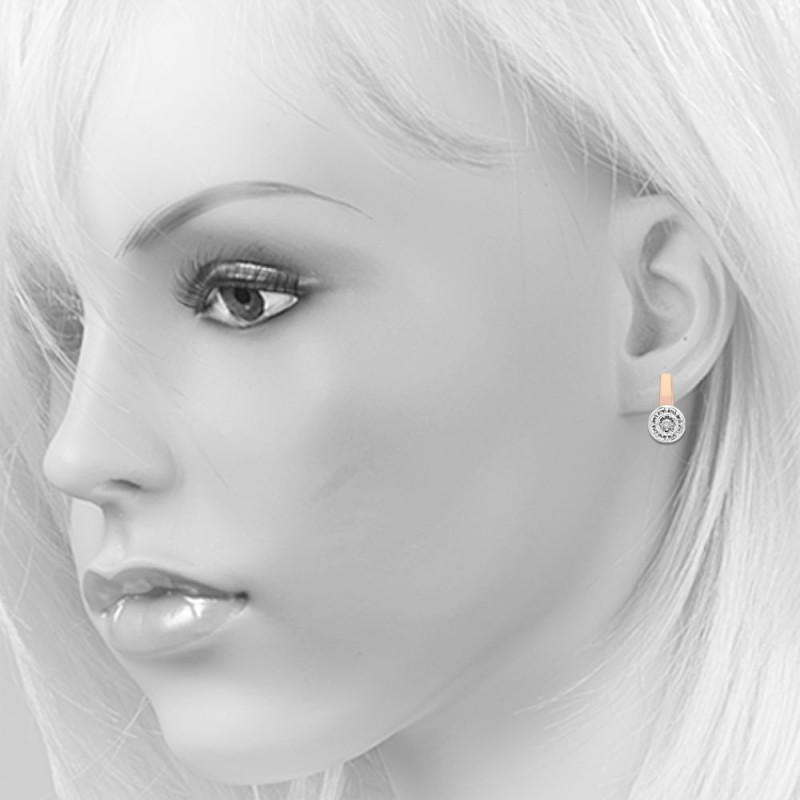 Pendientes de oro Dancing Diamond 585 oro ruso. Dancing Diamond: aretes encantadores y sensuales en oro rojo ruso de 14k con diamantes brillantes sobre un fondo de oro blanco con talla de diamante.